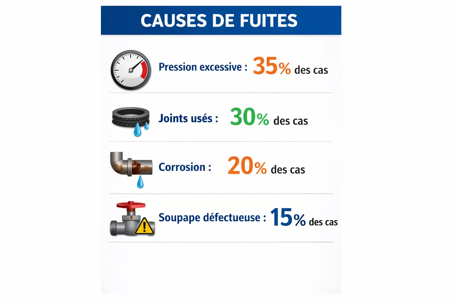 | Raccords de tuyauterie | Joint défectueux, serrage insuffisant | Faible à moyen |